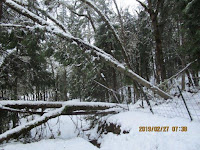 許多大樹承載不了頂端重壓的積雪, 紛紛傾倒.